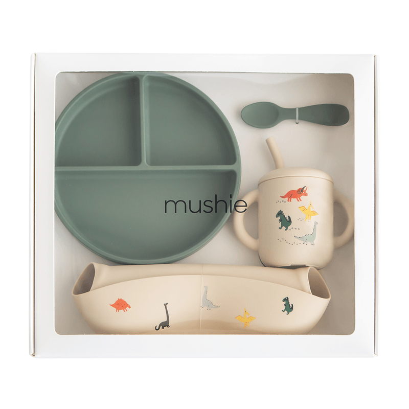 Com design delicado e tema de dinossauro, o conjunto une funcionalidade e estética minimalista, características marcantes da Mushie. Os itens são fáceis de higienizar e pensados para acompanhar o bebê nas diferentes fases da alimentação.