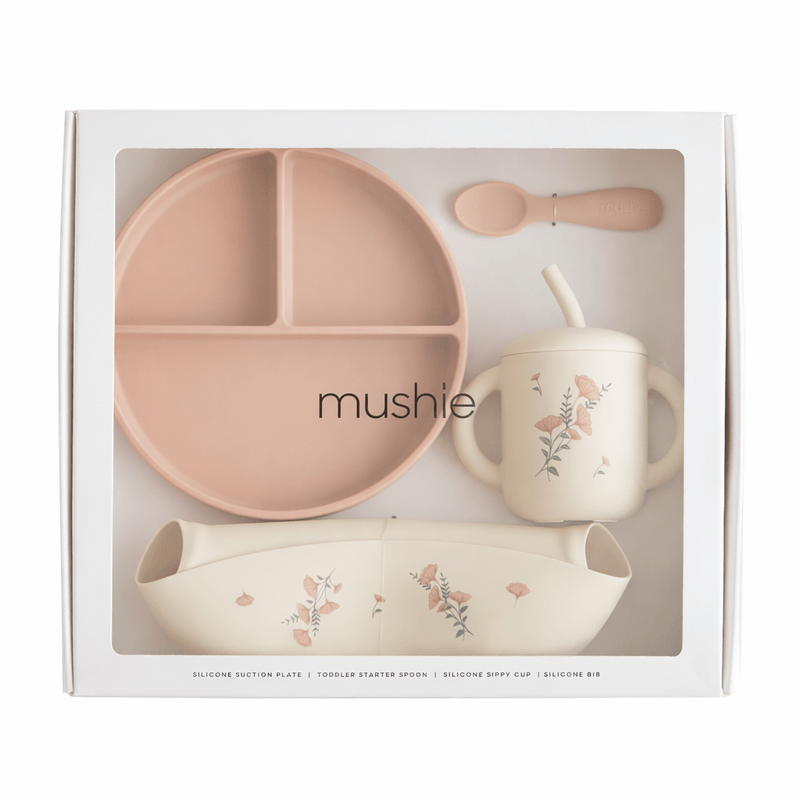Com design delicado e tema de Flores Rosa, o conjunto une funcionalidade e estética minimalista, características marcantes da Mushie. Os itens são fáceis de higienizar e pensados para acompanhar o bebê nas diferentes fases da alimentação.