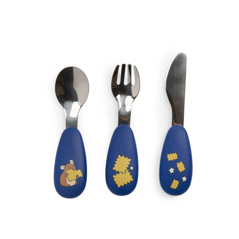 Conjunto com 3 talheres (garfo, colher e faca) em aço inoxidável e silicone, especialmente desenvolvidos para proporcionar o encaixe perfeito nas mãozinhas das crianças.